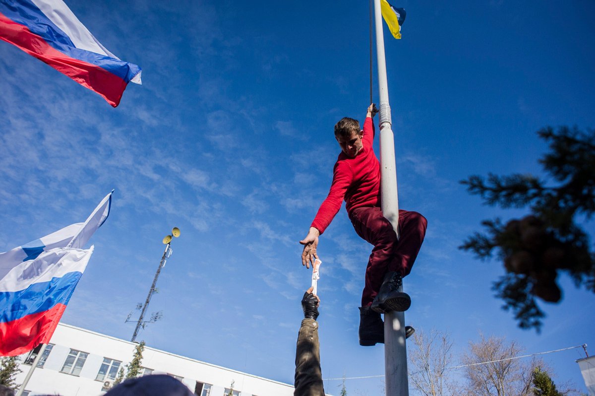 Участник пророссийского отряда самообороны тянется за ножом, чтобы снять украинский флаг в Севастополе, 19 марта 2014 года. Фото: AP Photo / Scanpix / LETA