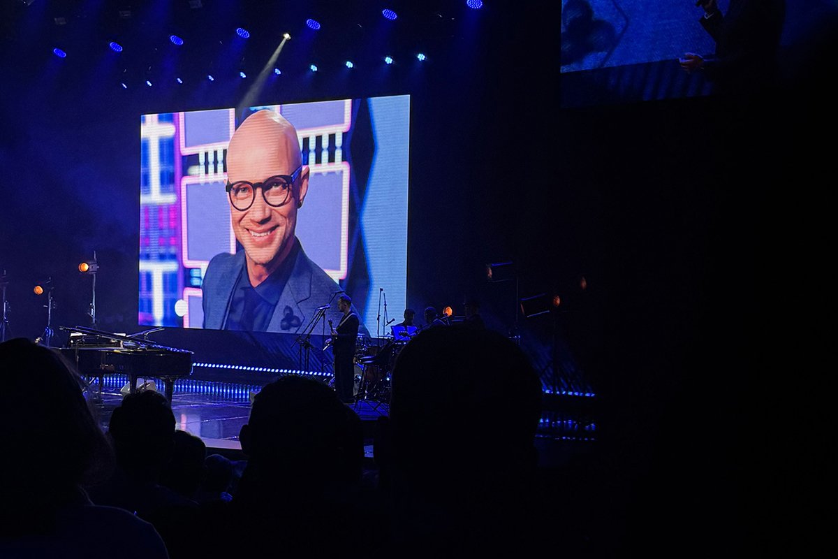 На сцене весь вечер был комик и сценарист Александр Гудков, долгие годы бывший соведущим «Вечернего Урганта». Гудков в 2022 году выпустил песню и клип «Я — узкий», пародию на творчество Z-певца Shaman. Из-за отъезда (а потом, вероятно, возвращения в Россию) его также требовали признать «иноагентом».