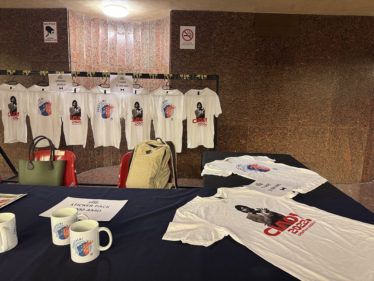 Очереди перед началом выступления распределились между фудкортом и столом, где продавался скромный набор фирменного мерча. Футболки «CIAO 2022 Giovanni Urganti» с отсылкой к новогоднему спецвыпуску можно было купить за 12 тысяч драмов (около 28 евро), а кружки с фирменной фразой Урганта «Работаем» — за 8 тысяч драмов.