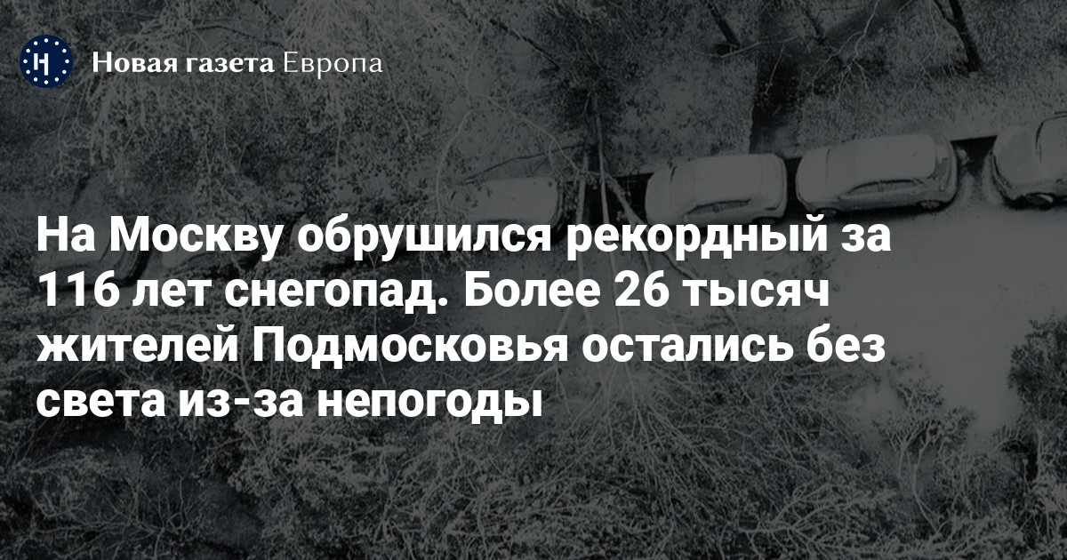 По словам губернатора Московской области Андрея Воробьева, из-за мокрого снега на проводах образовалась наледь. Кроме этого, за ночь упало большое количество деревьев. Всего в регионе были обесточены 237 линий электропередач и 4,4 тысячи трансформаторных подстанций. 26 тысяч человек остались без света.