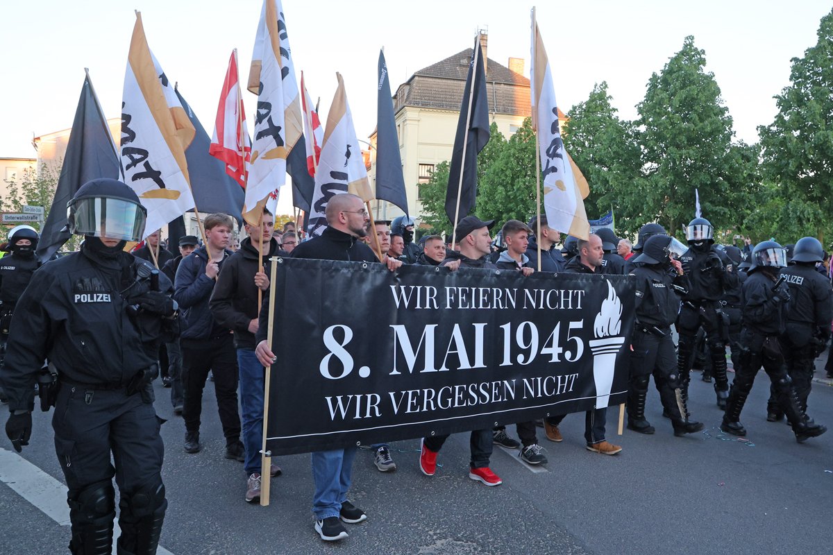Ультраправые с транспарантом «Мы не празднуем — 8 мая 1945 года — мы не забываем» на марше в Деммине, 8 мая 2024 года. Фото: Bernd Wüstneck / dpa / Scanpix / LETA