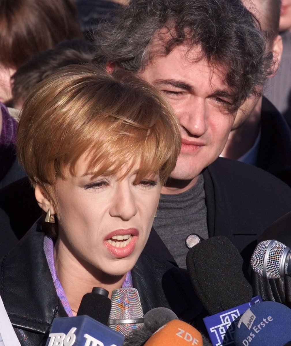 Журналисты НТВ Марианна Максимовская и Дмитрий Дибров разговаривают с коллегами у телецентра «Останкино» в Москве, 3 апреля 2001 года. Фото: Сергей Карпухин / Reuters / Scanpix / LETA