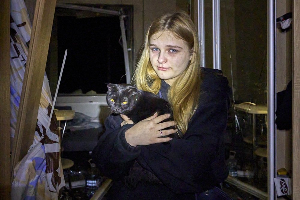 Maryna, 20, holds her cat Sirius in her damaged flat at the site of a drone strike near a residential building in Kharkiv, Ukraine, 2 May 2025. Photo: EPA-EFE/SERGEY KOZLOV