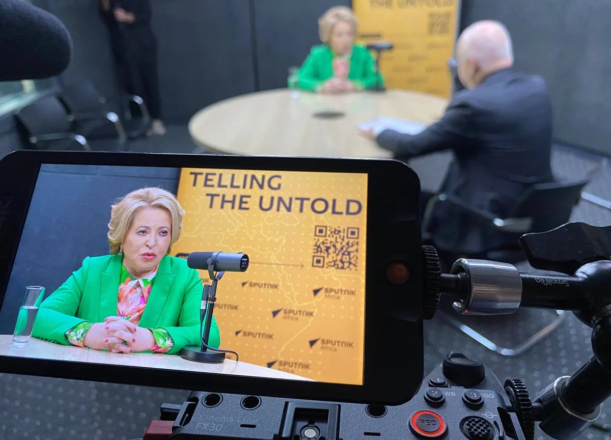 Valentina Matviyenko in the Sputnik studio in Addis Ababa, Ethiopia, 19 February 2025. Photo: Sputnik / Imago Images / Scanpix / LETA