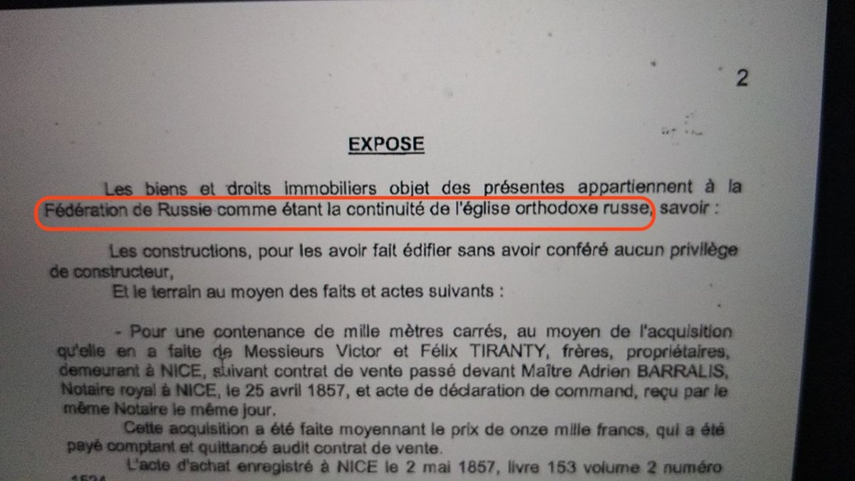 Вплоть до 2000-х приходы Ниццы, как и большинство русских православных общин Франции, не признавали над собою власть РПЦ и канонически подчинялись либо Русской архиепископии Константинопольского патриархата с центром в Париже, либо Русской зарубежной церкви с центром в Нью-Йорке. Согласно представленным РФ документам, на которые также ссылаются французские нотариусы и суды, покупку земли под храмы и кладбище совершали клирики дореволюционной греко-российской церкви по распоряжению митрополита Санкт-Петербургского, управлявшего приходами в Западной Европе, и с соизволения императора. Помимо того, что нотариусы парадоксально согласились считать РФ «продолжательницей» церкви, они допустили еще одну грубую ошибку: признали правопреемство РФ по отношению к Российской империи, в то время как сама РФ, согласно ст. 67.1 ее Конституции, является правопреемницей СССР. В свою очередь, советское правительство издало 29 августа 1918 года декрет, содержащий отказ от обязательств Российской империи, что советскими и постсоветскими правоведами трактовалось как отказ от правопреемства, — в связи с образованием совершенно нового государства нового типа. 30 ноября того же года Ленин подписал Положение о народном суде, которое прямо запрещает применять «законы свергнутых правительств». И действительно, в корпусе современного российского законодательства нет ни одной строчки из законодательства дореволюционного, которое, между прочим, к 1917 году насчитывало 16 томов и тысячи статей, зато сохраняется масса законодательных норм периода СССР.