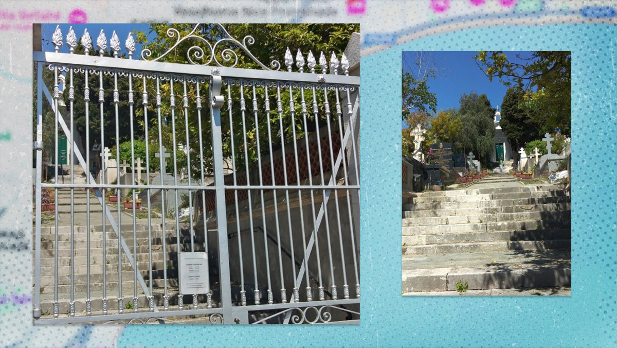 Слева: ворота на русское кладбище Кокад, закрытые представителями РФ. Справа: русское кладбище Кокад; лестница ведет к храму-часовне св. Николая; наверху предполагаемая сотрудница диппредставительства РФ. Фото: Лера Фурман