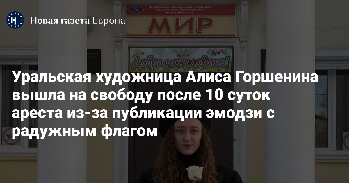 Художница Алиса Горшенина освободилась из спецприемника в Екатеринбурге после 10 суток ареста, передает местное издание It’s My City. Девушке вменили публичную демонстрацию экстремистской символики за публикацию эмодзи радужного флага в одной из соцсетей.