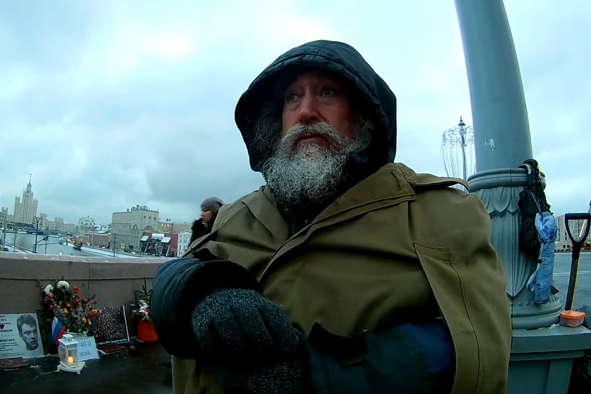 Григорий Саксонов дежурит у мемориала Бориса Немцова на Большом Москворецком мосту, 2019 год. Фото: @1112vk / YouTube