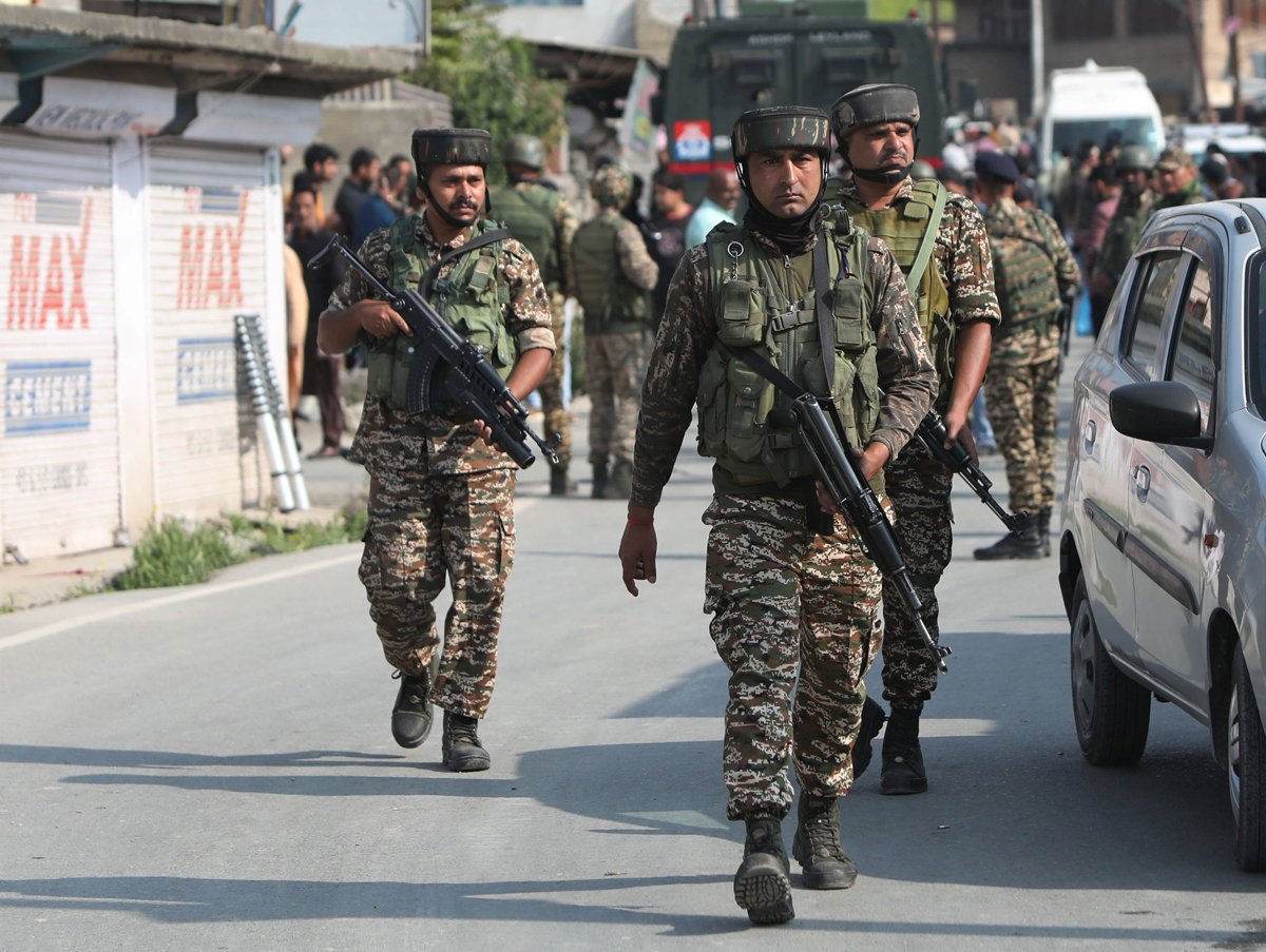 Индийские силы безопасности патрулируют дорогу в Пампоре, пригороде Сринагара, Индия, 7 мая 2025 года. Фото: Farooq Khan / EPA