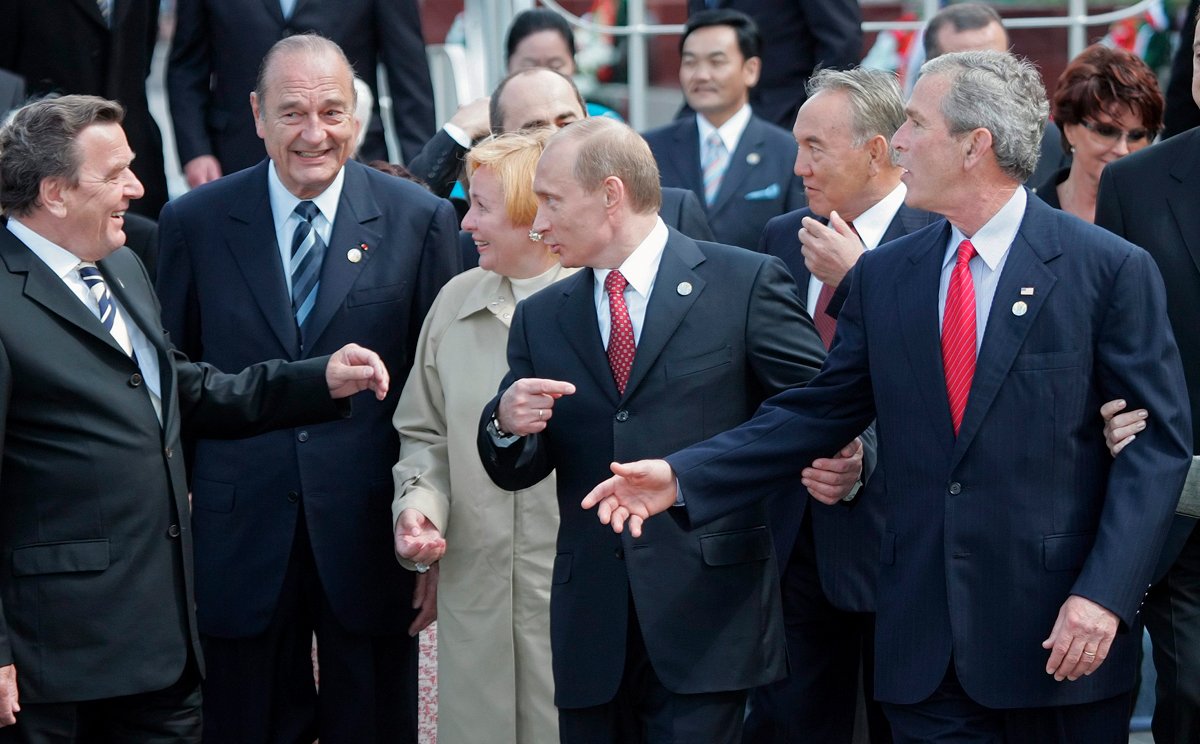 Слева направо: канцлер Германии Герхард Шрёдер, президент Франции Жак Ширак, Людмила Путина, Владимир Путин, президент Казахстана Нурсултан Назарбаев и президент США Джордж Буш во время церемонии возложения венков к Могиле Неизвестного Солдата у Кремлёвской стены в рамках празднования 60-й годовщины окончания Второй мировой войны, Москва, 9 мая 2005 года. Фото: Анатолий Мальцев / EPA