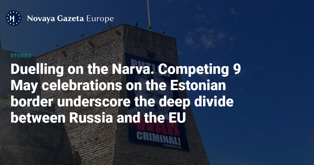 At the start of the Victory Day event in Ivangorod, the emcee welcomed his “dear friends” in the city of Narva, drawing cheers from the Estonian crowd that carried across the water. Just above their heads, a banner hung from the wall of the Narva Fortress featuring an image of Vladimir Putin and Adolf Hitler’s face spliced together that read: Putler War Criminal.