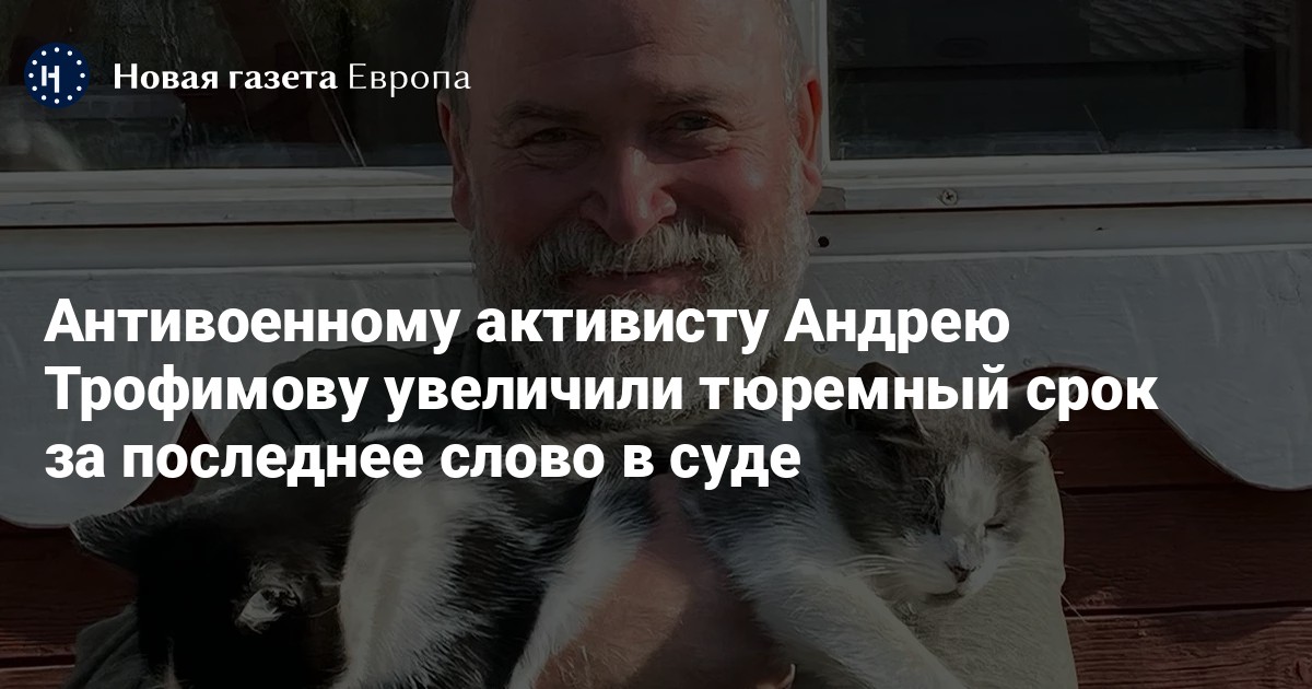 Антивоенному активисту и участнику московских протестов Андрею Трофимову увеличили срок заключения с 10 до 13 лет за последнее слово на первом процессе по делу о попытке вступить в легион «Свобода России» и постах в поддержку Украины. Об этом пишет «Медиазаона».