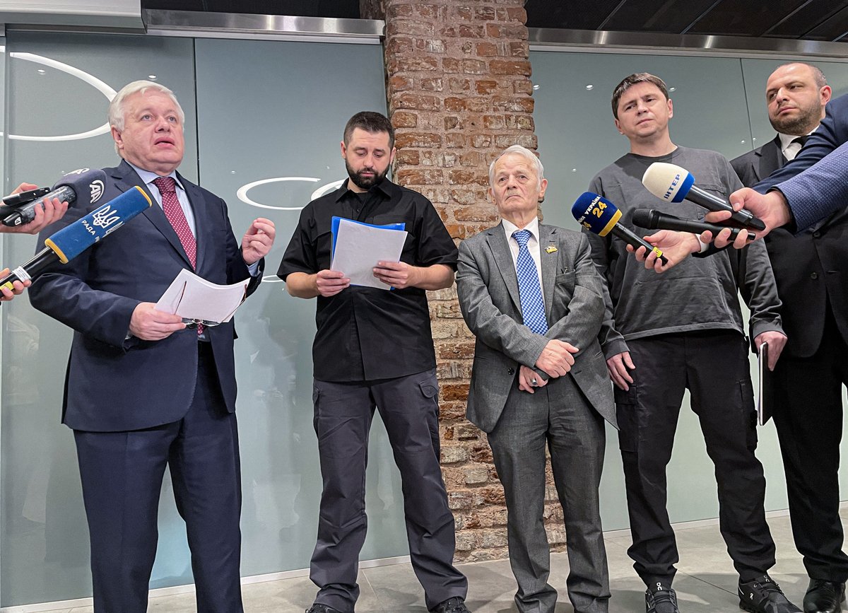 Члены украинской делегации (Александр Чалый, Михаил Подоляк, Мустафа Джемилев и Давид Арахамия) делают заявление для прессы после переговоров в Стамбуле, 29 марта 2022 года. Фото: Lokman Akkaya / Anadolu Agency / Abaca / Vida Press