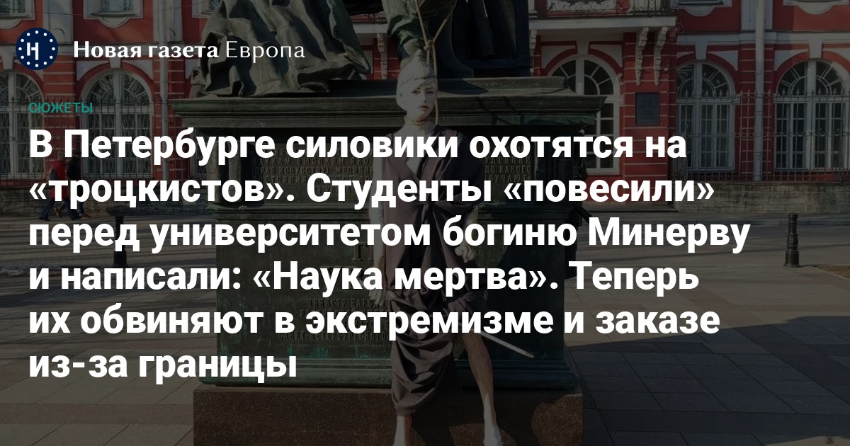 Силовики обратили внимание на «Рабочую власть» после акции «Наука мертва» 24 марта: к памятнику графа Уварова у здания СПбГУ подвесили манекен Минервы — изображенной на гербе университета римской богини мудрости и покровительницы науки. К ней добавили записку: «Наука мертва».