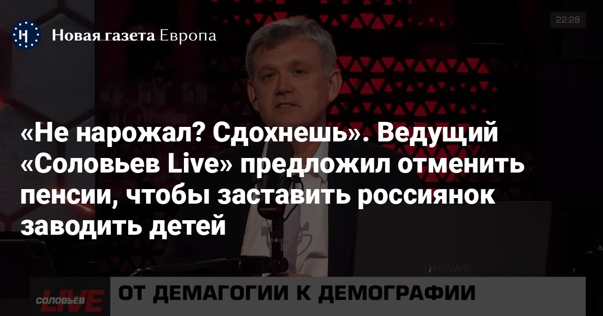 Ведущий «Соловьев Live» Сергей Мардан в эфире своего шоу заявил, что в России необходимо отменить пенсии, чтобы заставить граждан заводить детей.