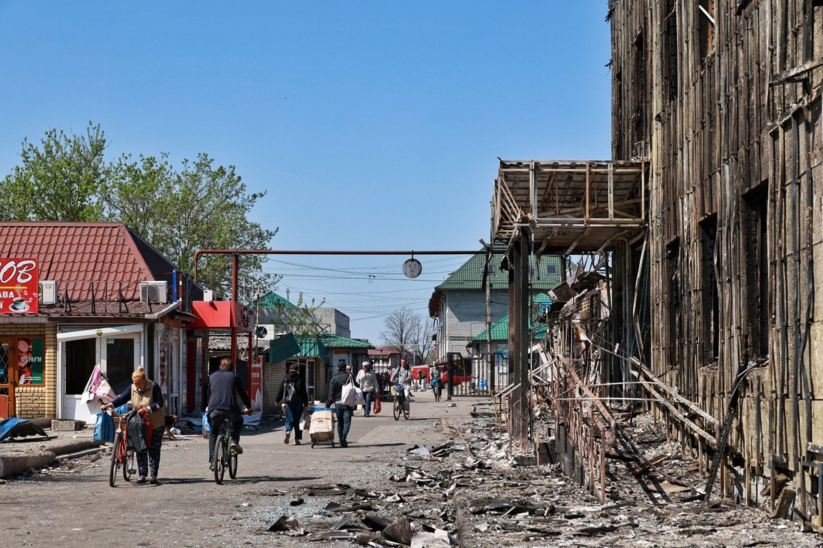 Люди проходят мимо магазинов, повреждённых в результате российского обстрела в Покровске, Донецкая область, 23 апреля 2025 года. Фото: Nina Liashonok / Ukrinform / Rex Features / Vida Press
