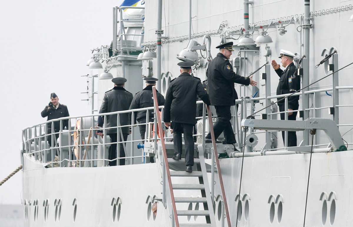Российские офицеры направляются на встречу с украинскими коллегами на борту корабля «Славутич» в Севастополе, 20 марта 2014 года. Фото: Василий Федосенко / Reuters / Scanpix / LETA