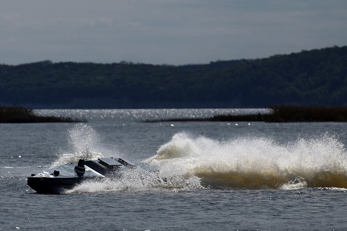 Украинский морской беспилотник Magura V5 на воде во время выставки военной техники, Украина, 13 апреля 2024 года. Фото: Valentyn Ogirenko / Reuters / Scanpix / LETA