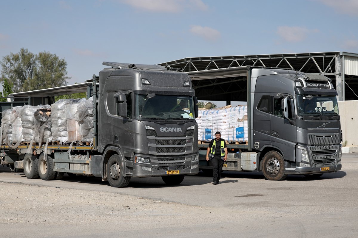Грузовики с гуманитарной помощью на контрольно-пропускном пункте Керем-Шалом, юг Израиля, 22 мая 2025 года. Фото: Atef Safadi / EPA