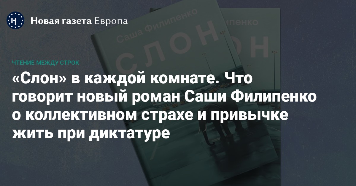 Романы Саши Филипенко написаны так, чтобы их можно было прочитать за раз, полностью погрузившись. Этот писательский подход хорошо монтируется с временем всеобщей спешки и рассредоточенности. Как и многие другие особенности «Слона» — небольшой объем (раньше называли бы «повестью»), динамичность, дробность (в текст вставлены «комментарии читателей», аналитические записки спецслужб, даже кроссворды), наконец, проблематика.