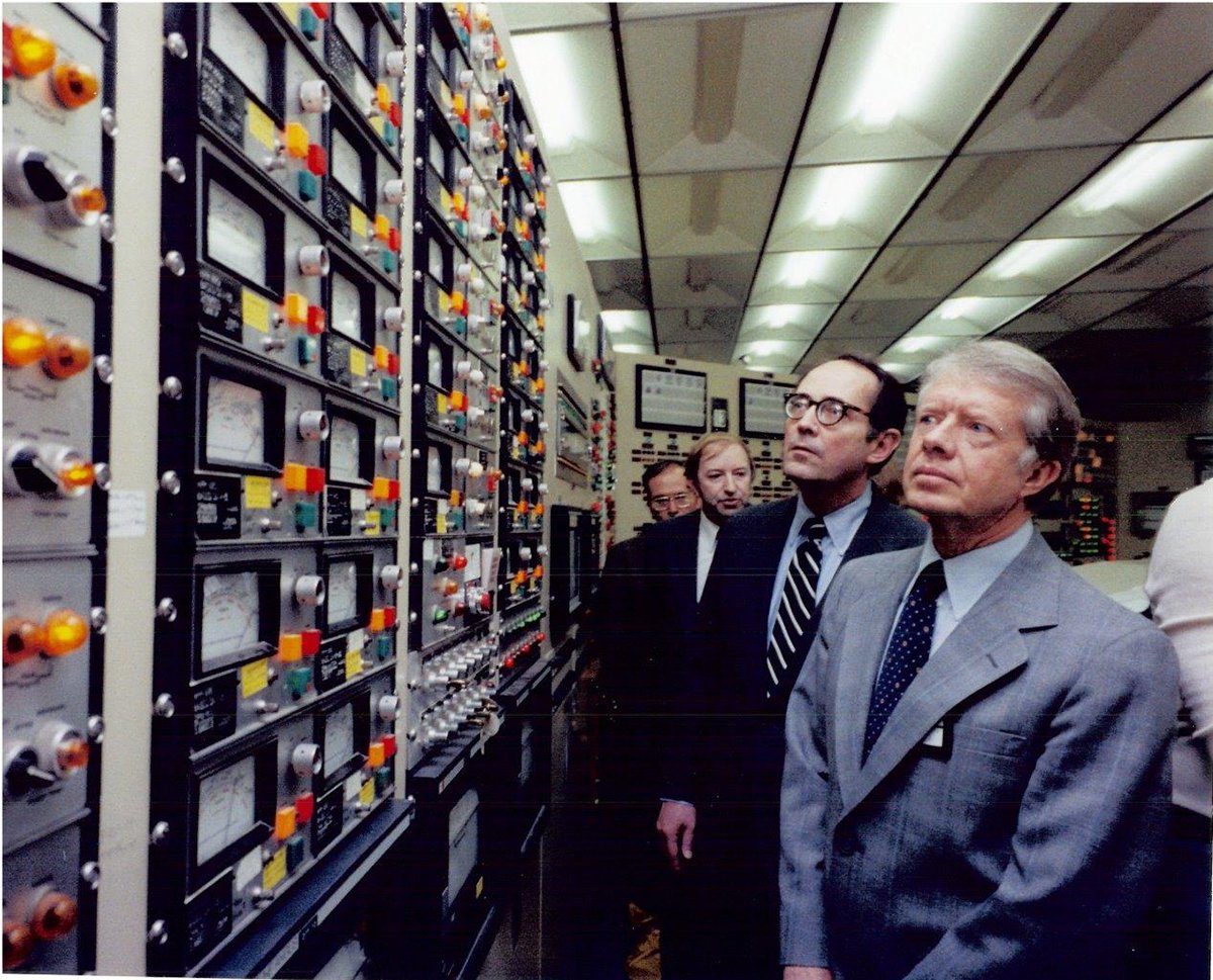 Президент США Джимми Картер и губернатор штата Пенсильвания Дик Торнберг осматривают панель приборов радиационного контроля в комнате управления АЭС Три-Майл-Айленд, 1 апреля 1979 года. Фото: общественное достояние / Wikimedia