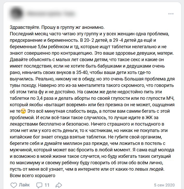 «Последний месяц часто читаю эту группу, и у всех женщин одна проблема — предохранение и беременность. В 20 — двое детей, в 29 — четверо детей, да еще и беременные пятым, шестым ребенком и т. д., которые ищут таблетки нелегально и не знают совершенно про контрацепцию. Это ваше здоровье, девушки, матери. Давайте объяснять с малых лет своим детям, что такое секс и какие он имеет последствия, если не хотите быть бабушками и дедушками очень рано, нянчить своих внуков в 35–40, чтобы ваши дети хоть где-то выучились.
