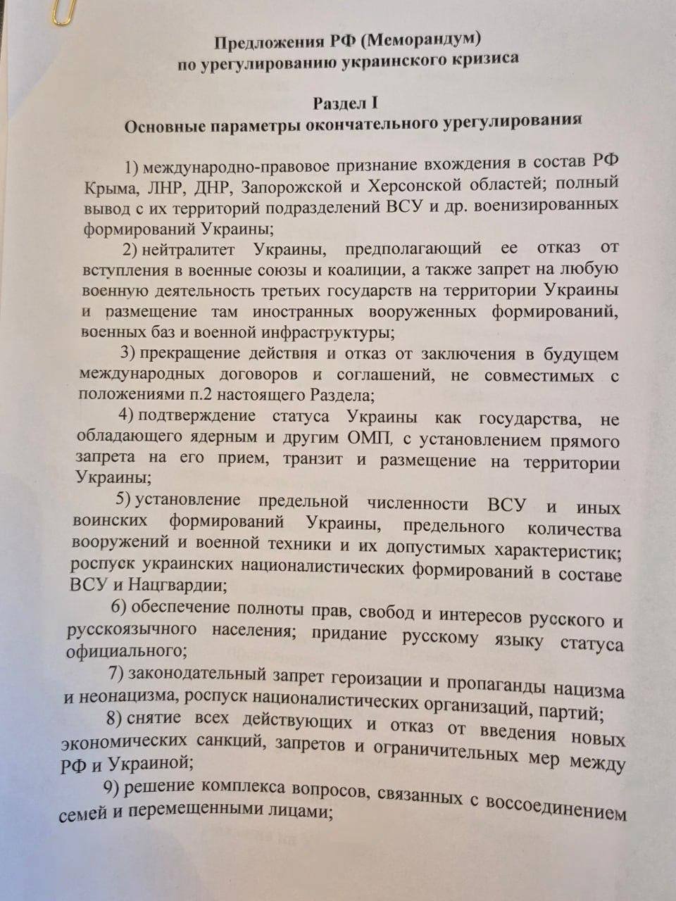 Полный текст украинского меморандума еще вчера вечером опубликовало Reuters: по данным агентства, Киев разработал поэтапный план урегулирования, который предполагает полное прекращение огня сроком не менее чем на 30 дней, обмен всеми военнопленными, возвращение украинских детей, вывезенных Россией, а также личную встречу Владимира Зеленского и Владимира Путина.