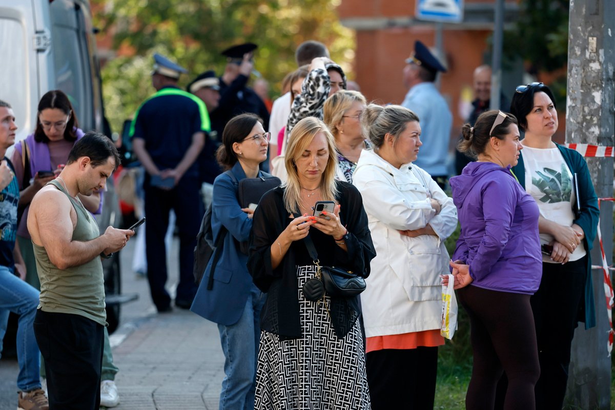 Местные жители у повреждённого после атаки дрона жилого дома в Раменском, Московская область, 10 сентября 2024 года. Фото: Юрий Кочетков / EPA