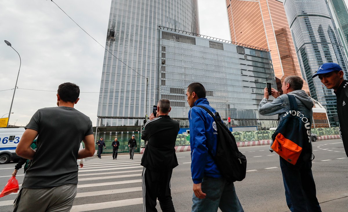 Прохожие фотографируют на телефоны последствия попадания дрона по зданию в деловом центре «Москва-Сити», 23 августа 2023 года. Фото: Юрий Кочетков / EPA