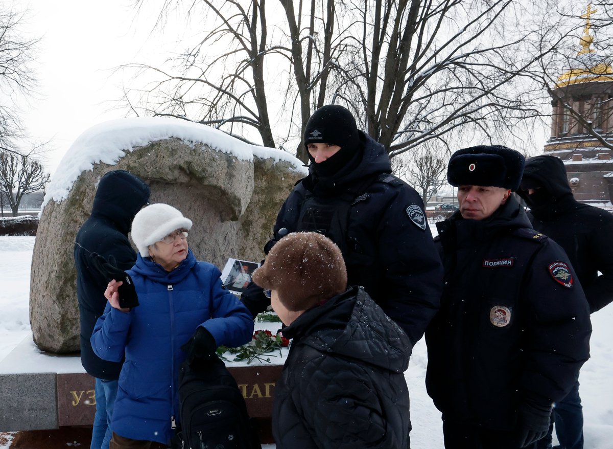 Полиция задерживает женщину за попытку разместить портрет Алексея Навального на мемориале политическим заключенным в Санкт-Петербурге, 16 февраля 2025 года. Фото: Анатолий Мальцев / EPA