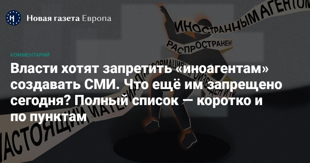 «Новая-Европа» собрала список того, что запрещено «иноагентам» сегодня, — коротко (насколько это возможно) и по пунктам.