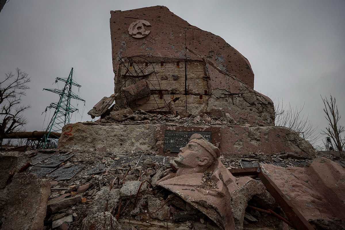 Разрушенный памятник у главного входа на металлургический комбинат «Азовсталь» в Мариуполе, 7 декабря 2022 года. Фото: Sergey Ilnitsky / EPA-EFE