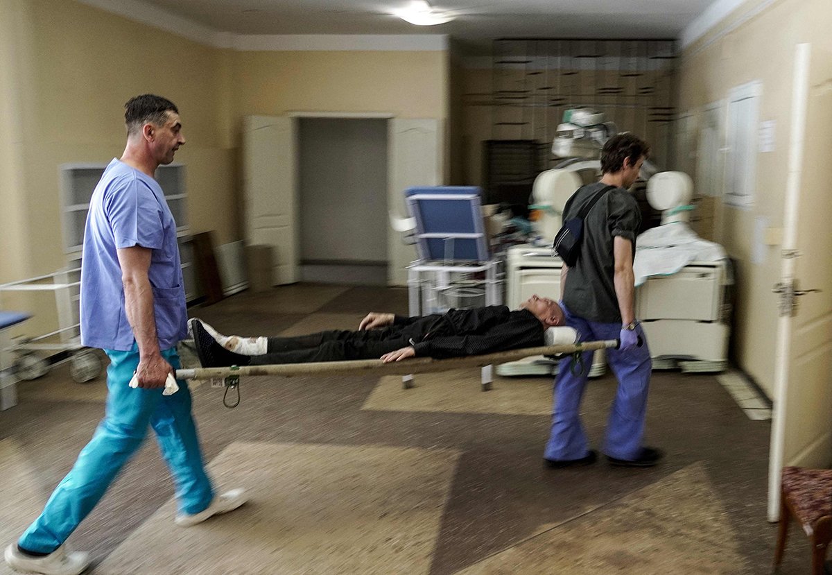 Медики несут мужчину на носилках в больницу Мариуполя 3 июня 2022 года. Фото: AFP / Scanpix / LETA