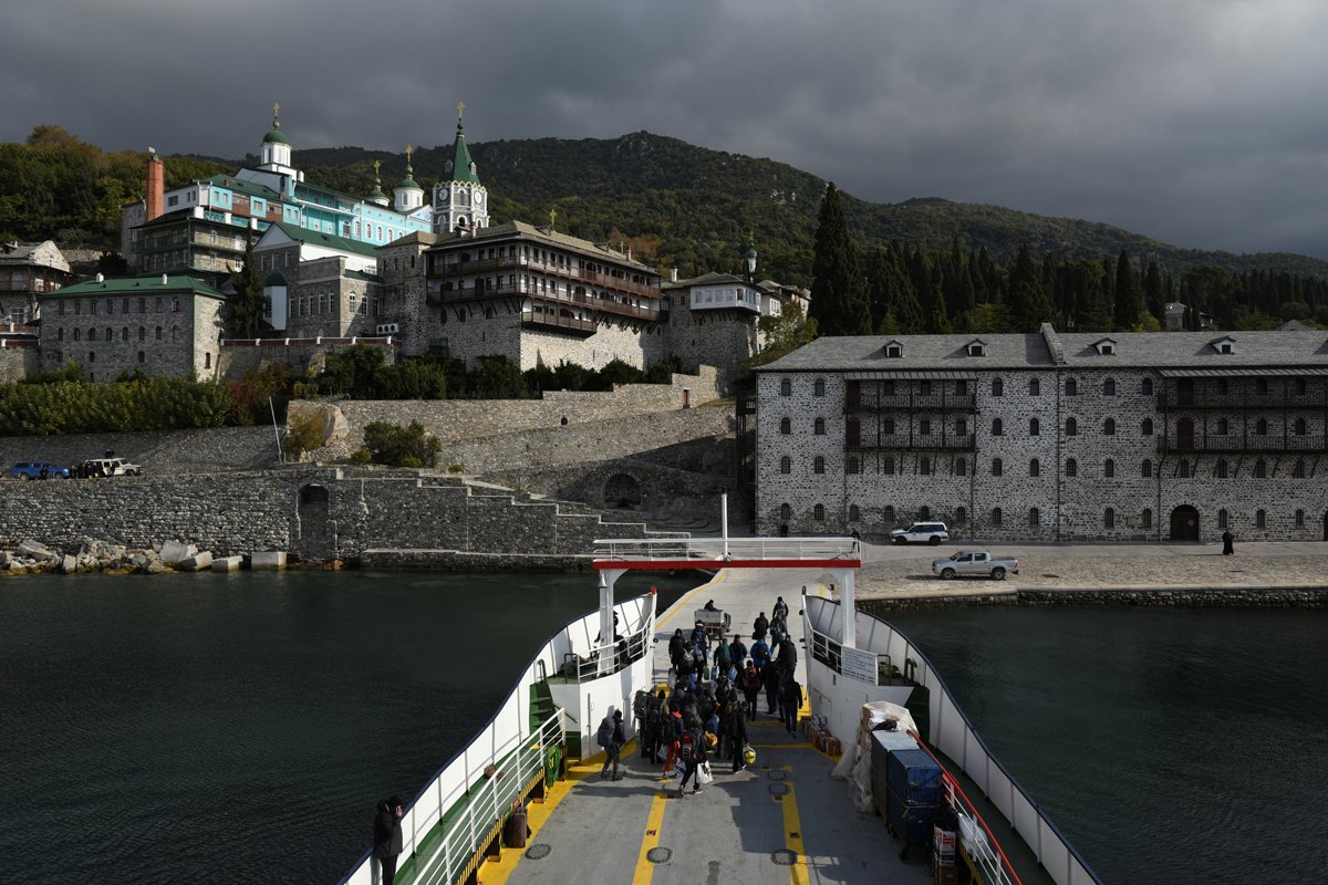 Паломники высаживаются с парома у монастыря Святого Пантелеимона на Афоне, Греция, 16 ноября 2021 года. Фото: Alexandros Avramidis / Reuters / Scanpix / LETA