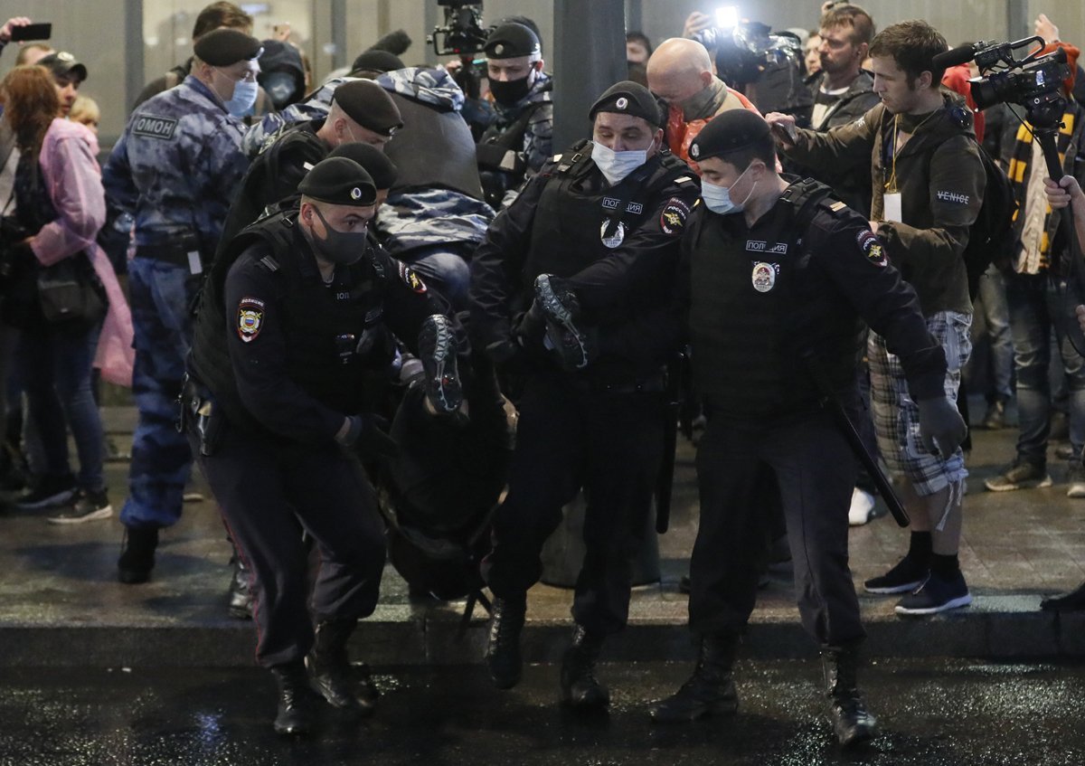 Полицейские задерживают участника митинга после объявления итогов голосования по поправкам к Конституции РФ на Пушкинской площади в Москве, 15 июля 2020 года. Фото: Юрий Кочетков / EPA