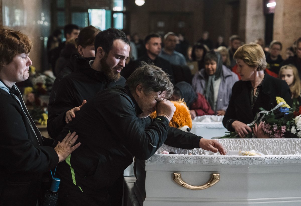 Игорь Мартынюк (в центре), отец погибших в результате российского ракетного удара троих детей, скорбит во время церемонии прощания в Коростышеве, Житомирская область, 28 мая 2025 года. Фото: Andrew Kravchenko / EPA