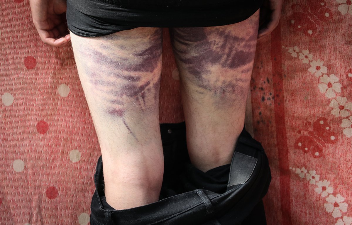 Синяки на ногах мужчины, который был избит полицией после освобождения из следственного изолятора в Минске, Беларусь, 14 августа 2020 года. Фото: Tatiana Zenkovich / EPA