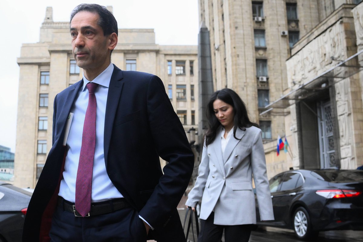 Посол Азербайджана в России Рахман Мустафаев у здания МИД РФ, Москва, 1 июля 2025 года. Фото: Алексей Мишев / Спутник / Imago Images / Scanpix / LETA