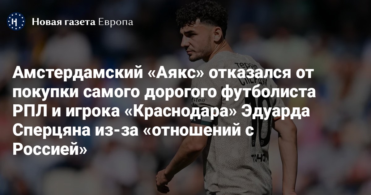 Самый титулованный футбольный клуб Нидерландов, амстердамский «Аякс», отказался от трансфера игрока «Краснодара» и сборной Армении Эдуарда Сперцяна, сообщает ESPN со ссылкой на источники.