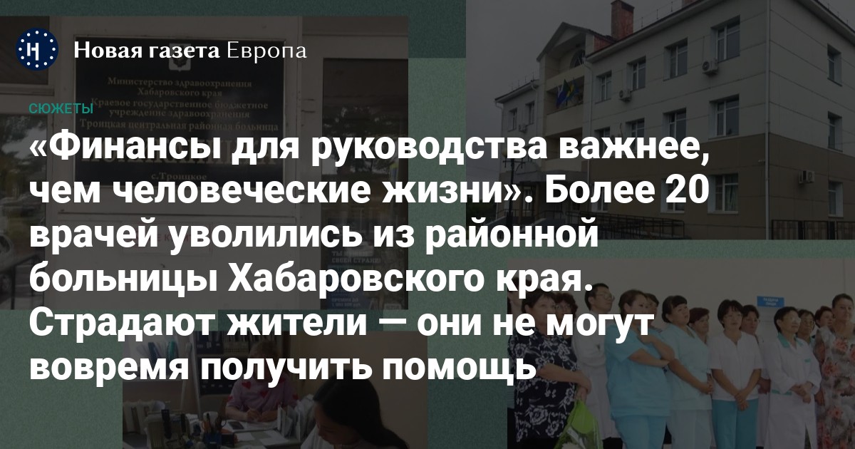 Из Троицкой центральной районной больницы Хабаровского края за последнее время уволились более 20 врачей. Из-за этого в регионе возникла острая нехватка тех, кто мог бы своевременно оказать помощь жителям близлежащих населенных пунктов. Пациенты лишены доступа к узким специалистам.