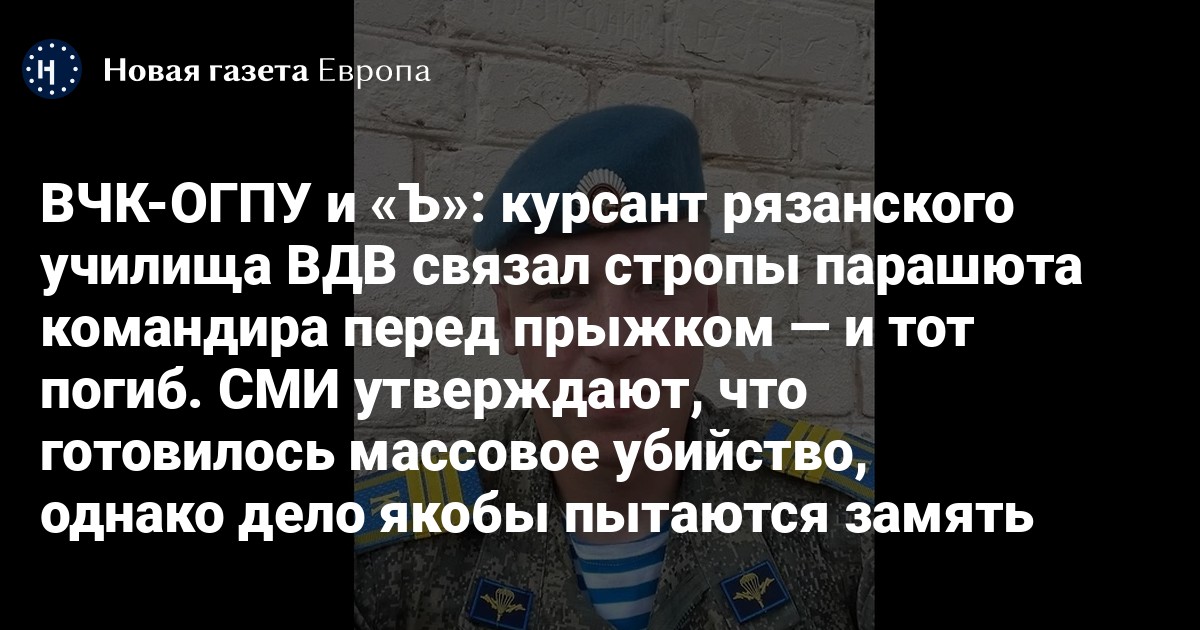 В Рязанском высшем воздушно-десантном училище (РВВДУ) имени генерала Маргелова десантник убил своего командира, перед прыжком связав стропы его парашютов. Об этом сообщают ВЧК-ОГПУ и «Коммерсант» со ссылкой на источники.