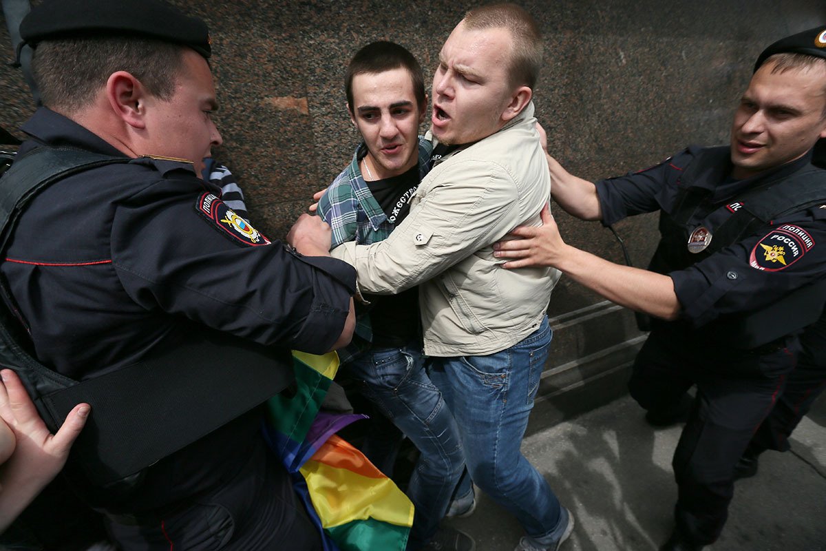 Сотрудники полиции арестовывают двух представителей российского ЛГБТК+ сообщества, которые пытались провести парад возле здания Государственной Думы России в Москве, Россия, 25 мая 2013 года. Фото: Сергей Ильницкий / EPA