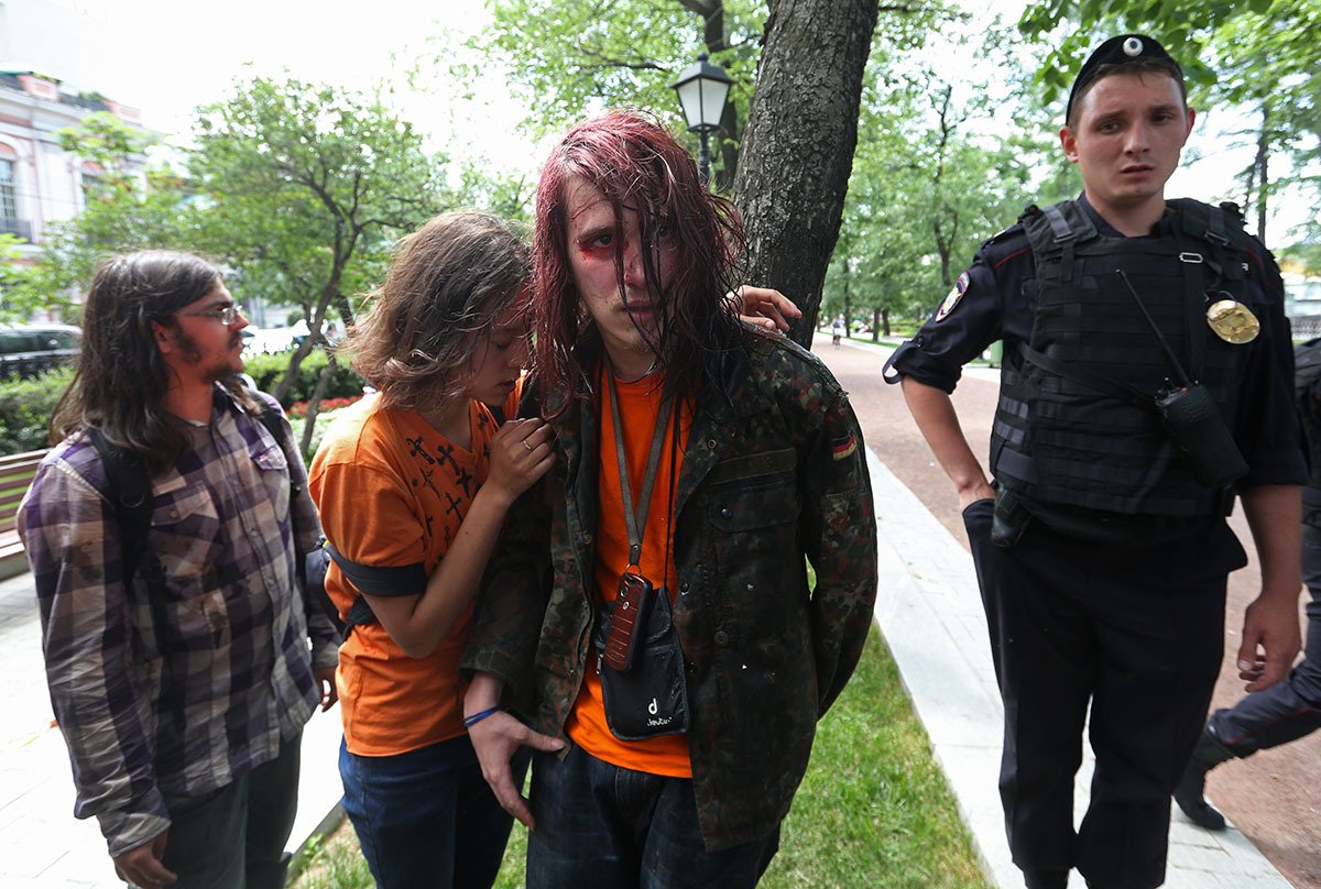 Представитель ЛГБТК+, на которого напали после акции протеста перед зданием Государственной Думы в Москве, Россия, 11 июня 2013 года. Фото: Сергей Чириков / EPA