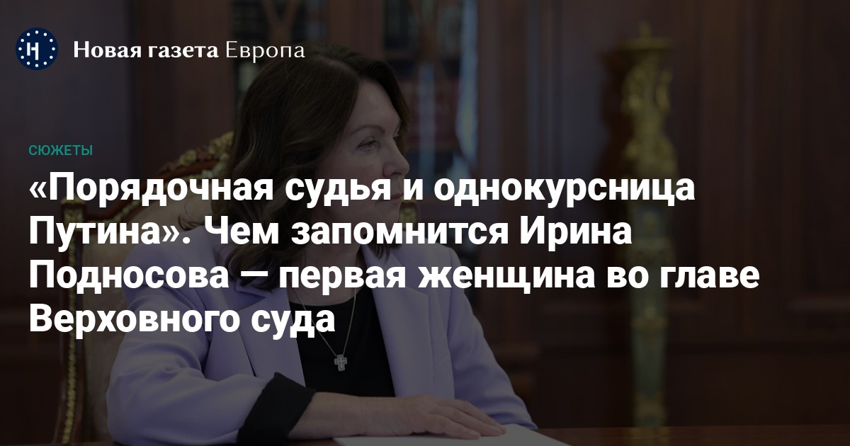 По некоторым данным, соглашаясь весной 2024 года занять должность главы главного суда страны (а кандидатуру ее внес в Совфед сам Путин), 70-летняя Подносова знала, что уже болела, но предложение было из разряда тех, от которых невозможно отказаться. Почему выбор пал именно на нее — широкой публике стало известно тогда же. Подносова — однокурсница Владимира Путина по юрфаку Ленинградского университета имени Жданова (ныне Санкт-Петербургский госуниверситет). Своя.