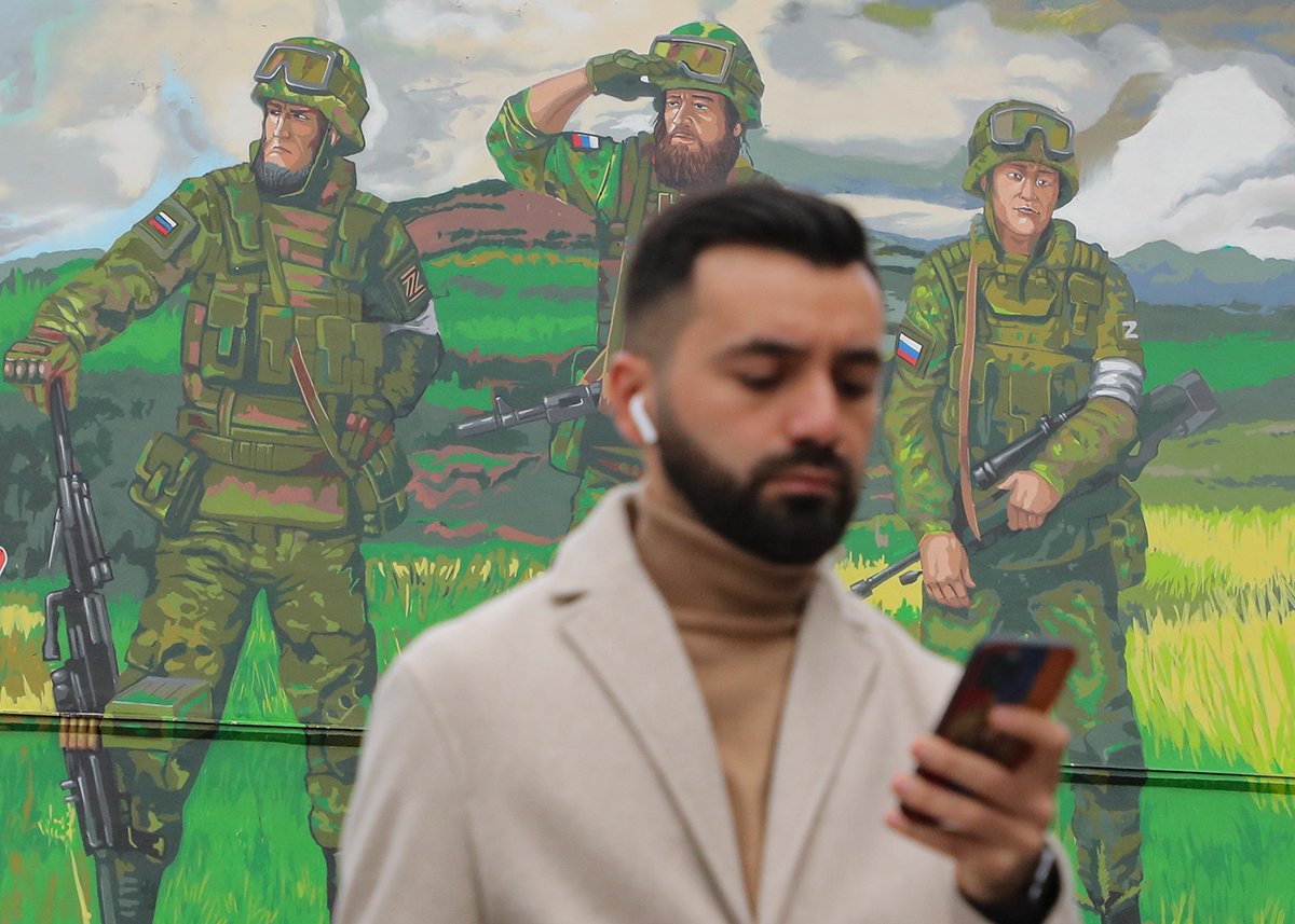 Мужчина проходит мимо жилого дома, украшенного фреской с изображением российских войск, в Москве, Россия, 21 сентября 2022 года. Фото: Максим Шипенков / EPA