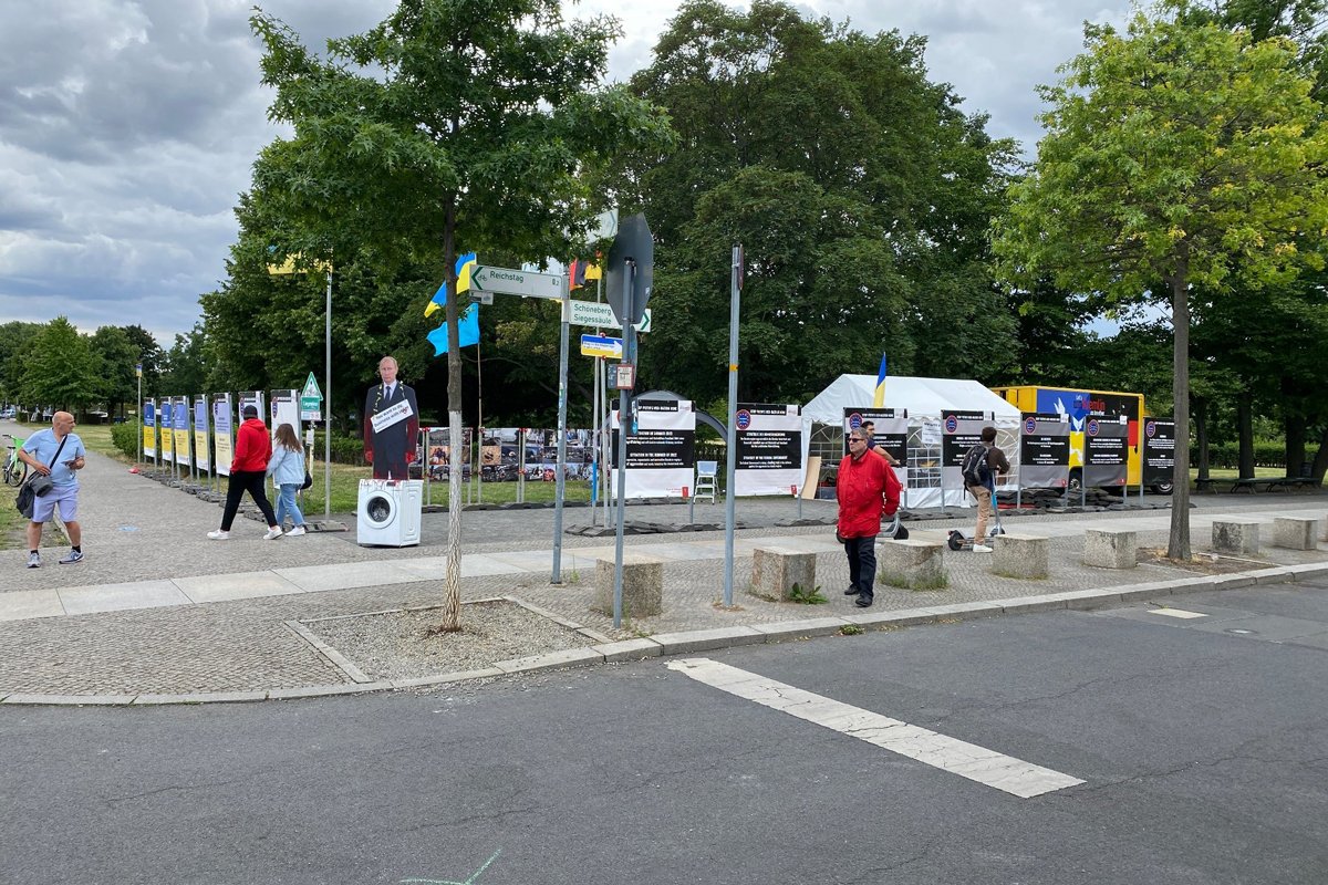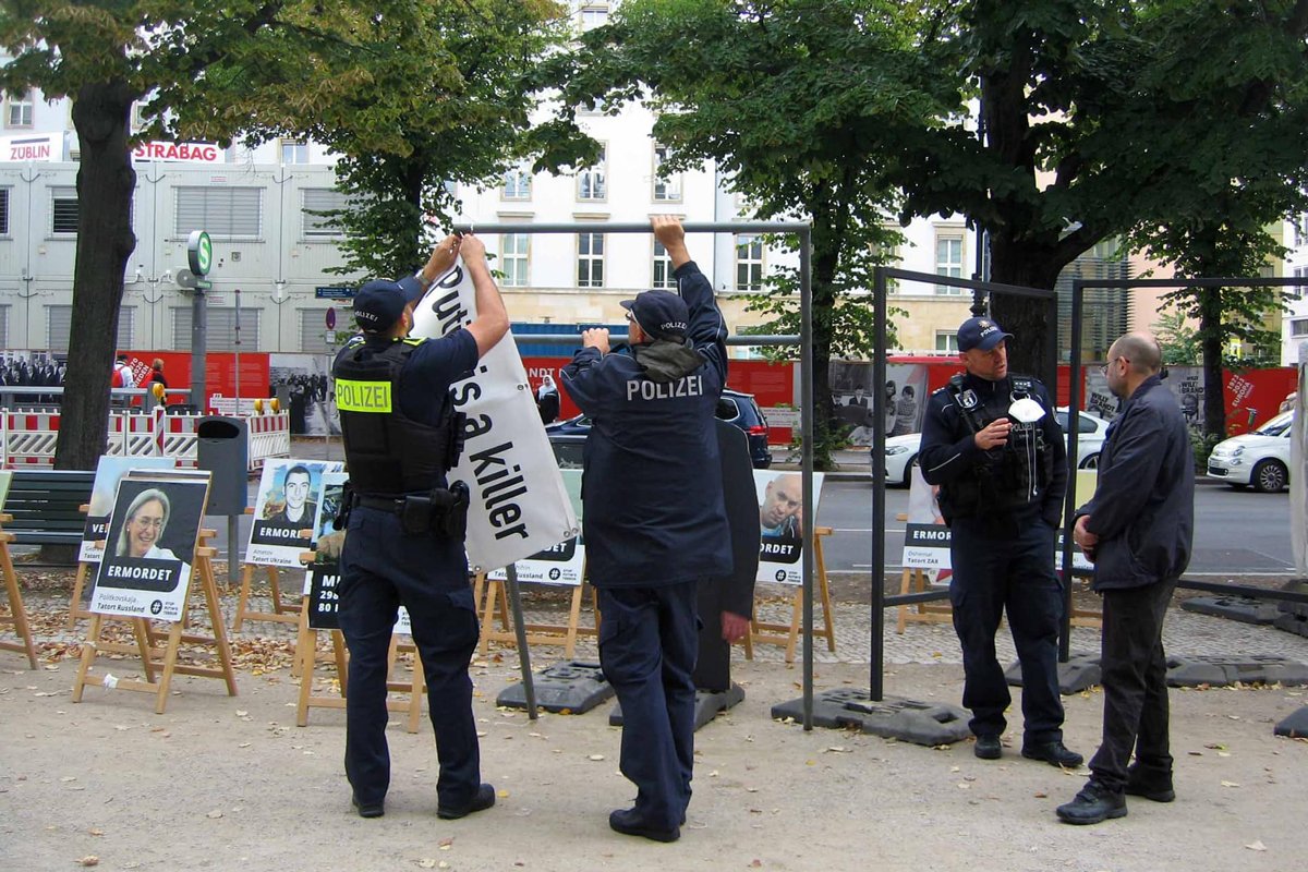 Полиция изымает баннер «Putin is a killer» у лагеря Баграша перед российским посольством, Берлин, 18 сентября 2021 года. Фото: Дмитрий Баграш / Facebook
