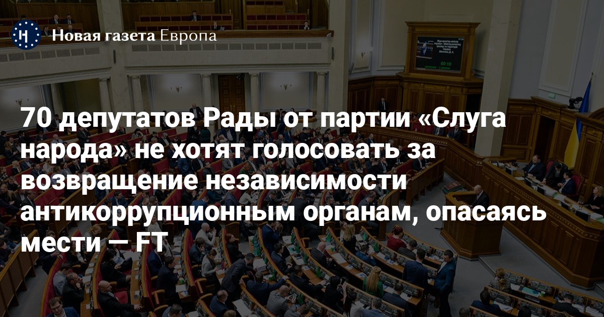 Около 70 депутатов Верховной рады из партии президента Владимира Зеленского «Слуга народа» не хотят голосовать за возвращение независимости НАБУ и САП из опасений, что антикоррупционные органы отомстят им за поддержку действующей версии закона. Об этом сообщает Financial Times cо ссылкой на источники.