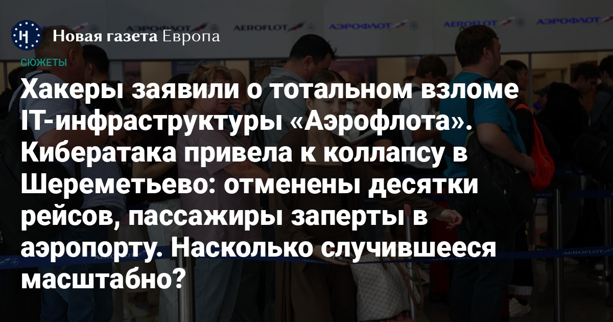 Утром 28 июля сотни пассажиров «Аэрофлота» оказались заперты в московском аэропорту Шереметьево из-за массовой отмены рейсов. Люди не могли ни улететь, ни свободно покинуть терминал. Причиной коллапса, по заявлению хакерских групп Silent Crow и «Киберпартизаны BY», стал масштабный взлом, уничтоживший внутренние системы авиаперевозчика. В Генпрокуратуре подтвердили хакерскую атаку. В Кремле ситуацию назвали «тревожной».