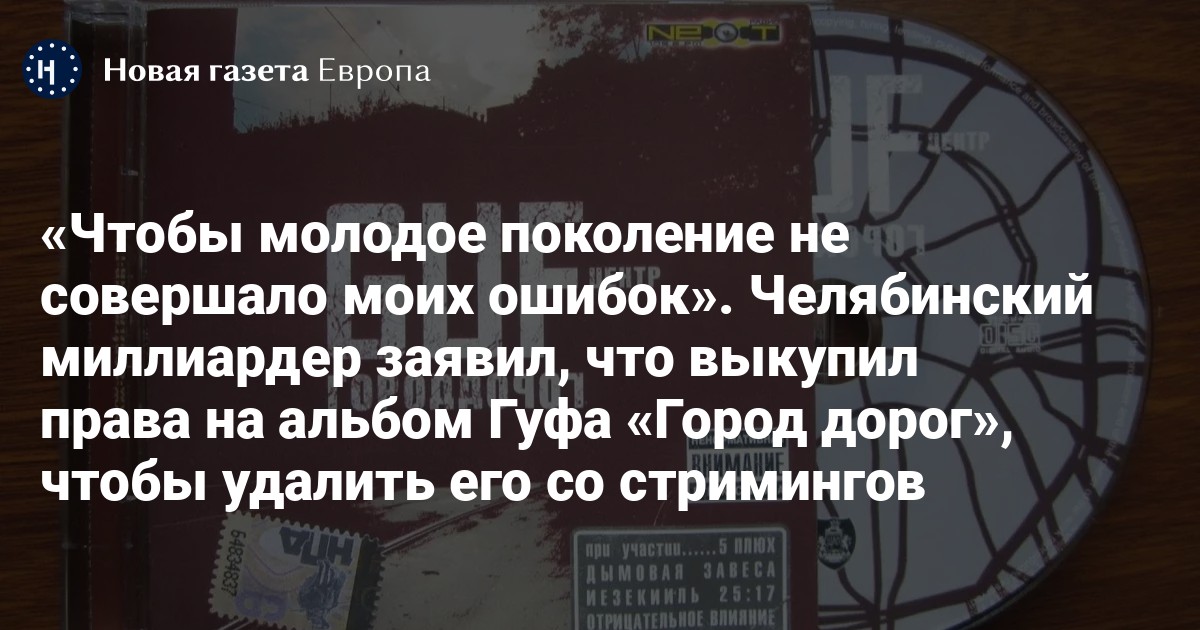 Челябинский миллиардер Игорь Рыбаков заявил, что приобрел авторские права на дебютный альбом рэп-исполнителя Гуфа «Город дорог», чтобы удалить его со всех музыкальных площадок.