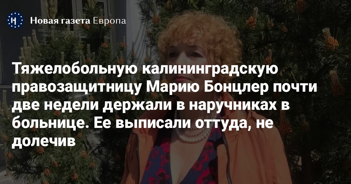 Арестованную по делу о передаче иностранным спецслужбам данных о российских силовиках 65-летнюю калининградскую правозащитницу Марию Бонцлер 12 дней держали в наручниках в больницах и выписали, не доведя курс лечения до конца. Об этом сообщает The Insider со ссылкой на адвокатский опрос подсудимой.
